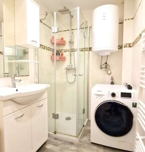 Ухоженное оборудование: ламинированные полы, современная душевая кабина, светлые комнаты.